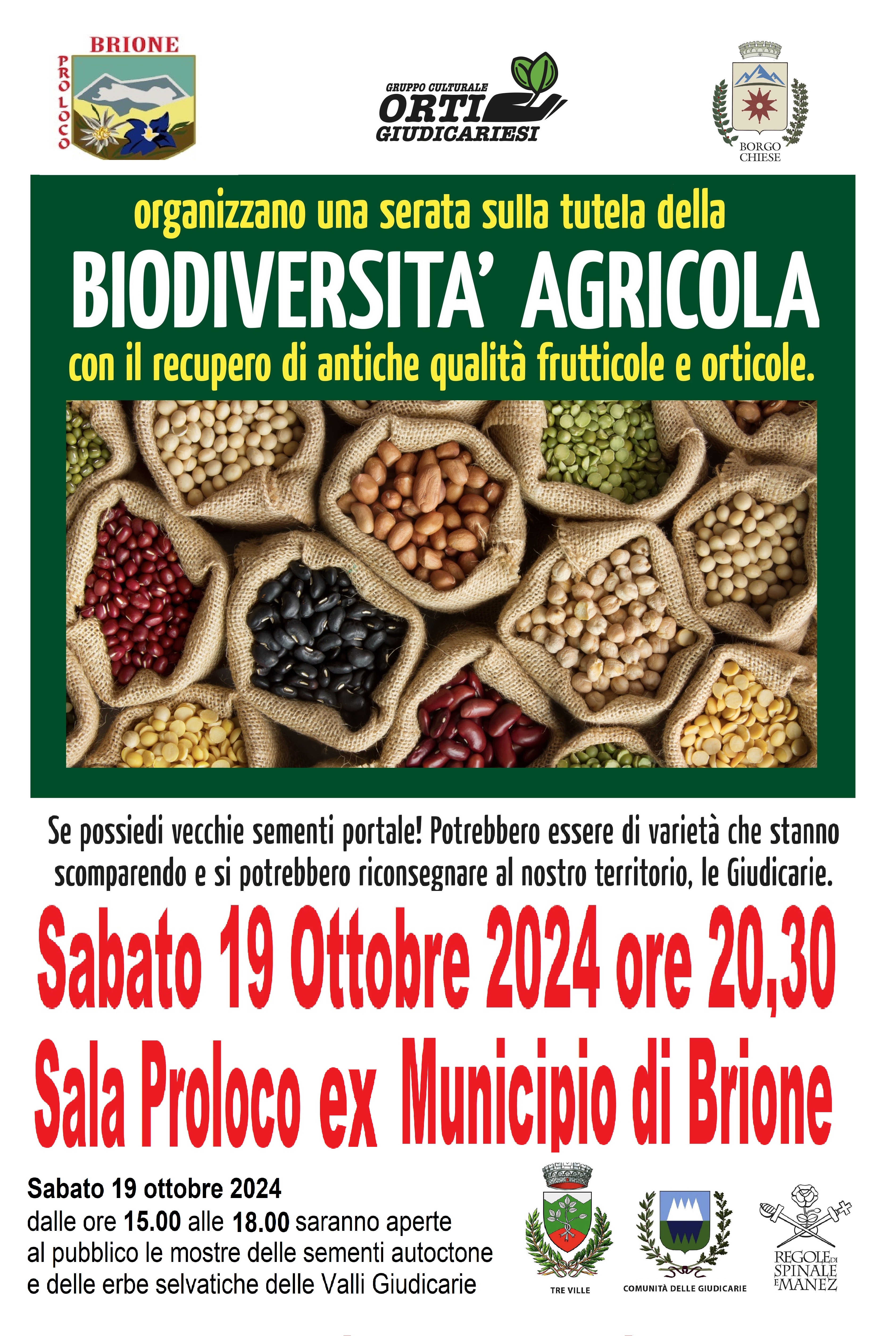 Dalle ore 15.00 alle ore 18.00 saranno aperte al pubblico le mostre delle sementi autoctone e delle erbe selvatiche delle Valli Giudicarie.